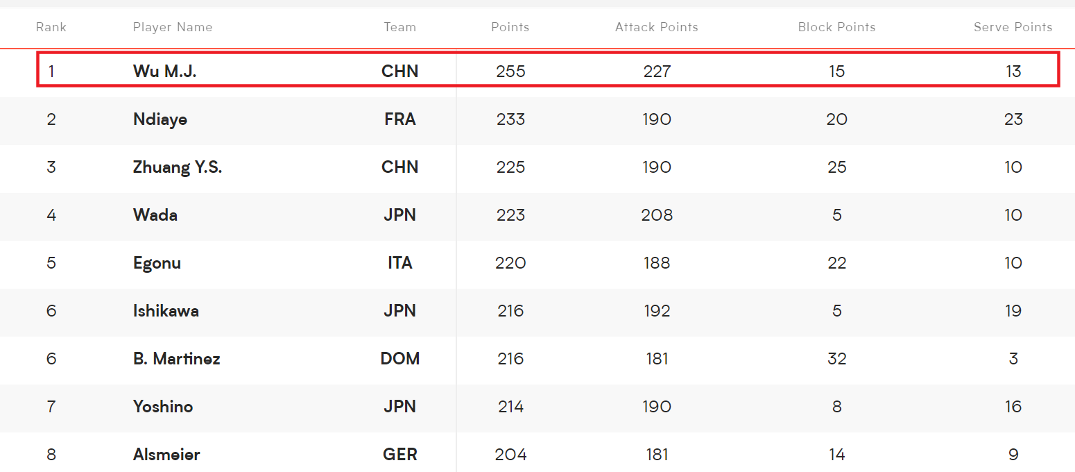 2025世界女排联赛上,吴梦洁共计得到255分排名得分榜第一,是世界女排联赛得分王。吴梦洁扣球得到227分也是排名第一,扣球成功率44.95%。15次拦网得分,13次发球直接得分,表现很全面。